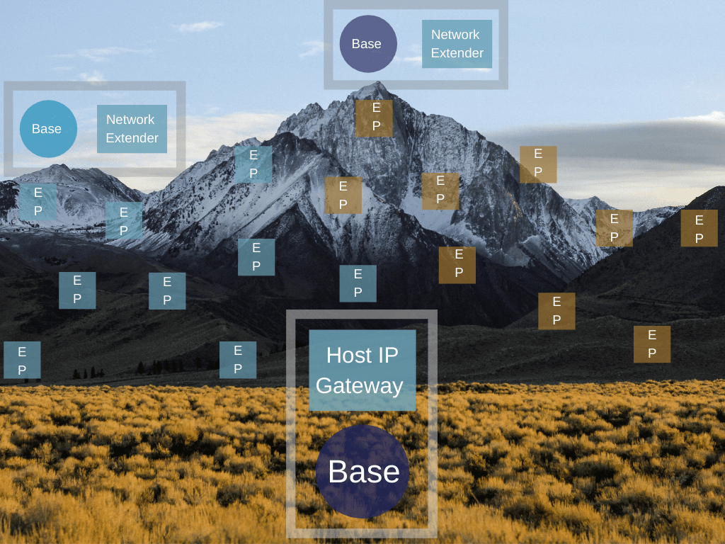 Multiple base stations can be connected in an extended network to increase coverage, range or both. Network extender endpoints combine with standard bases to create starlets. Starlets can then be combined within the normal star configuration to allow for tremendous flexibility (please refer to the technology page for more information).